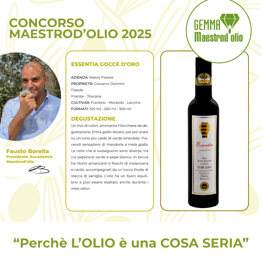 Un’altra GEMMA  al nostro “Essentia Gocce D’Oro”  Biologico, IGP Toscano Colline di Firenze, da parte di Fausto Borella che ancora una volta ha dato un riconoscimento al nostro Olio e lo ha  inserito nella sua  prestigiosa Guida.